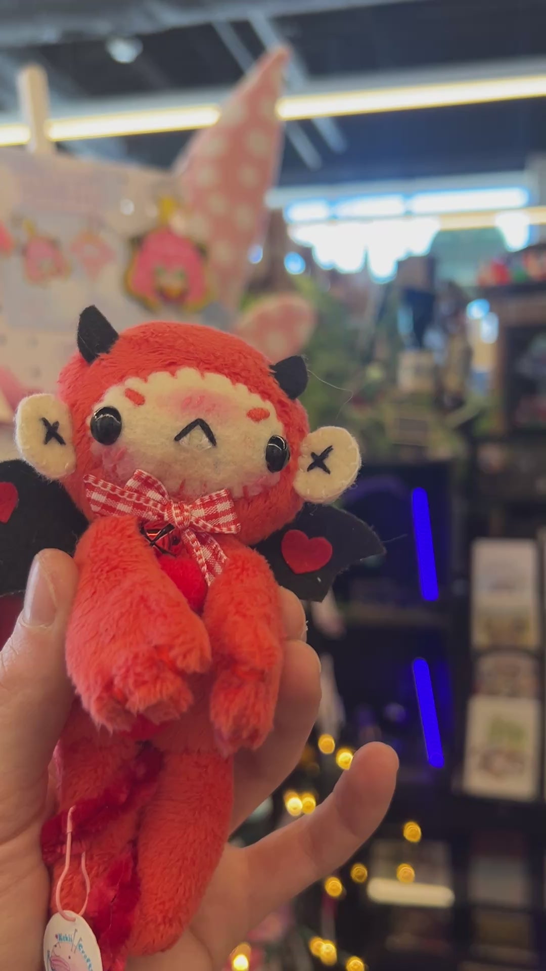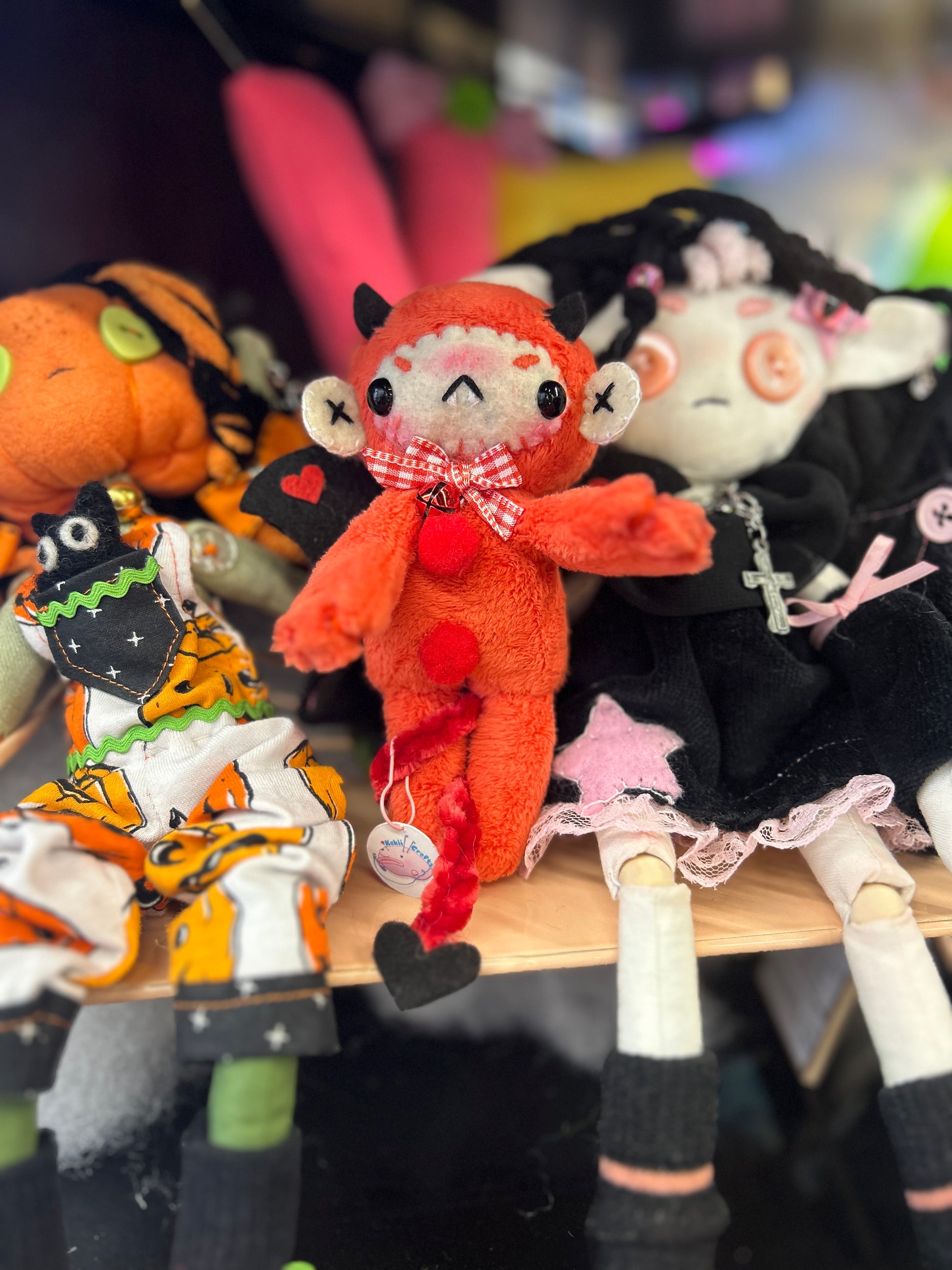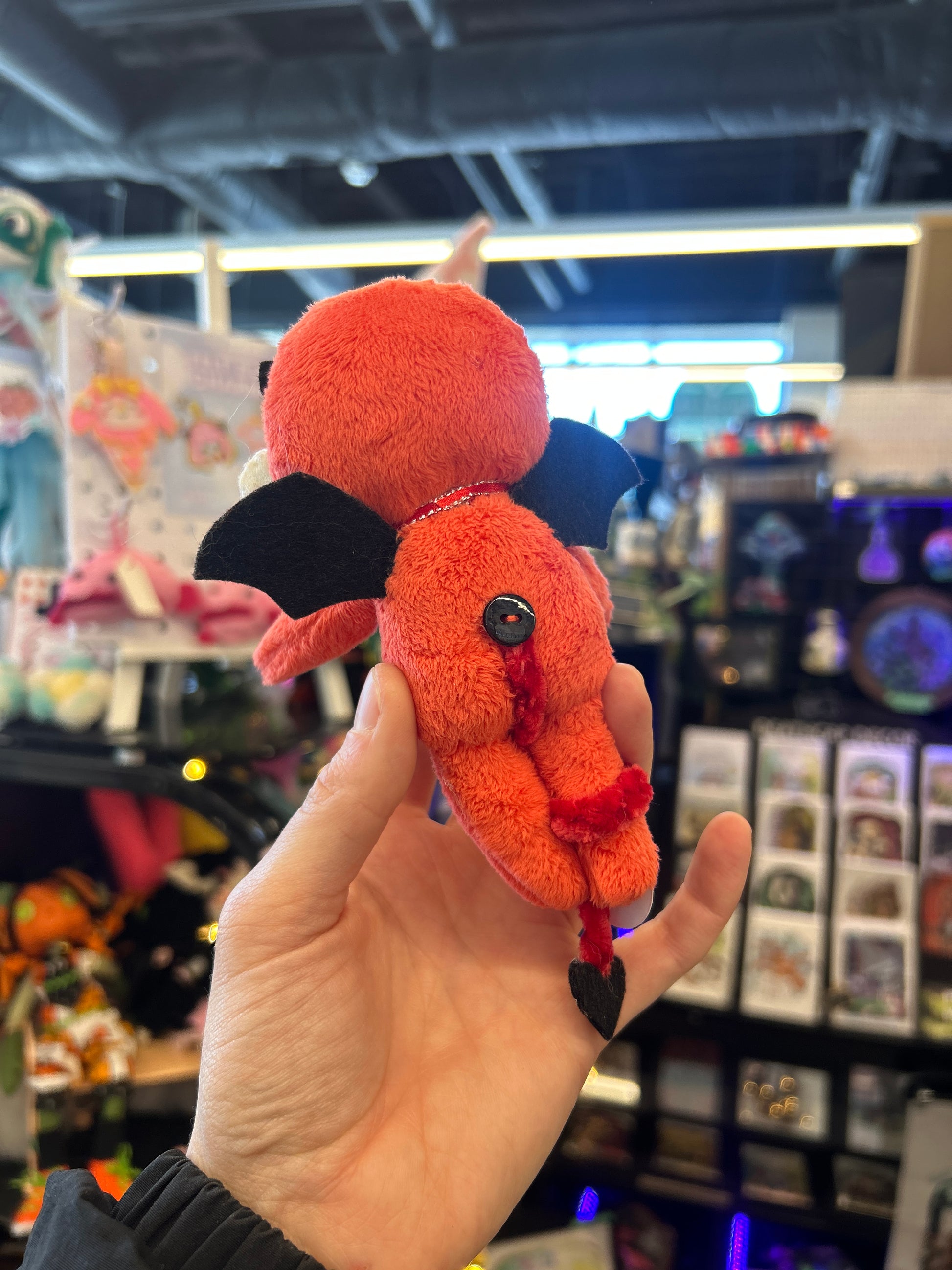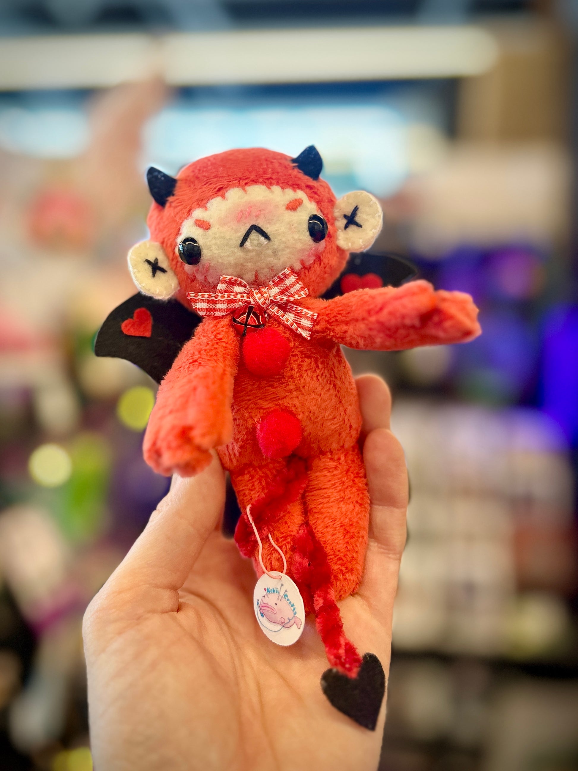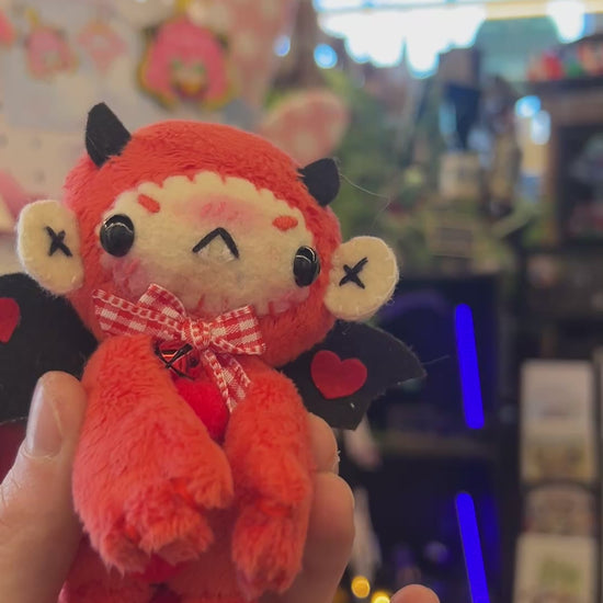 He is completely conceptualized and handmade by me. His body is sewn with super plush minky fabric. His face details are craft felt and embroidered with cotton thread. He has craft felt wings and horns and a crocheted velvet tail. He also has a sultry bumber crack. A perfect gift for someone with similar assets!