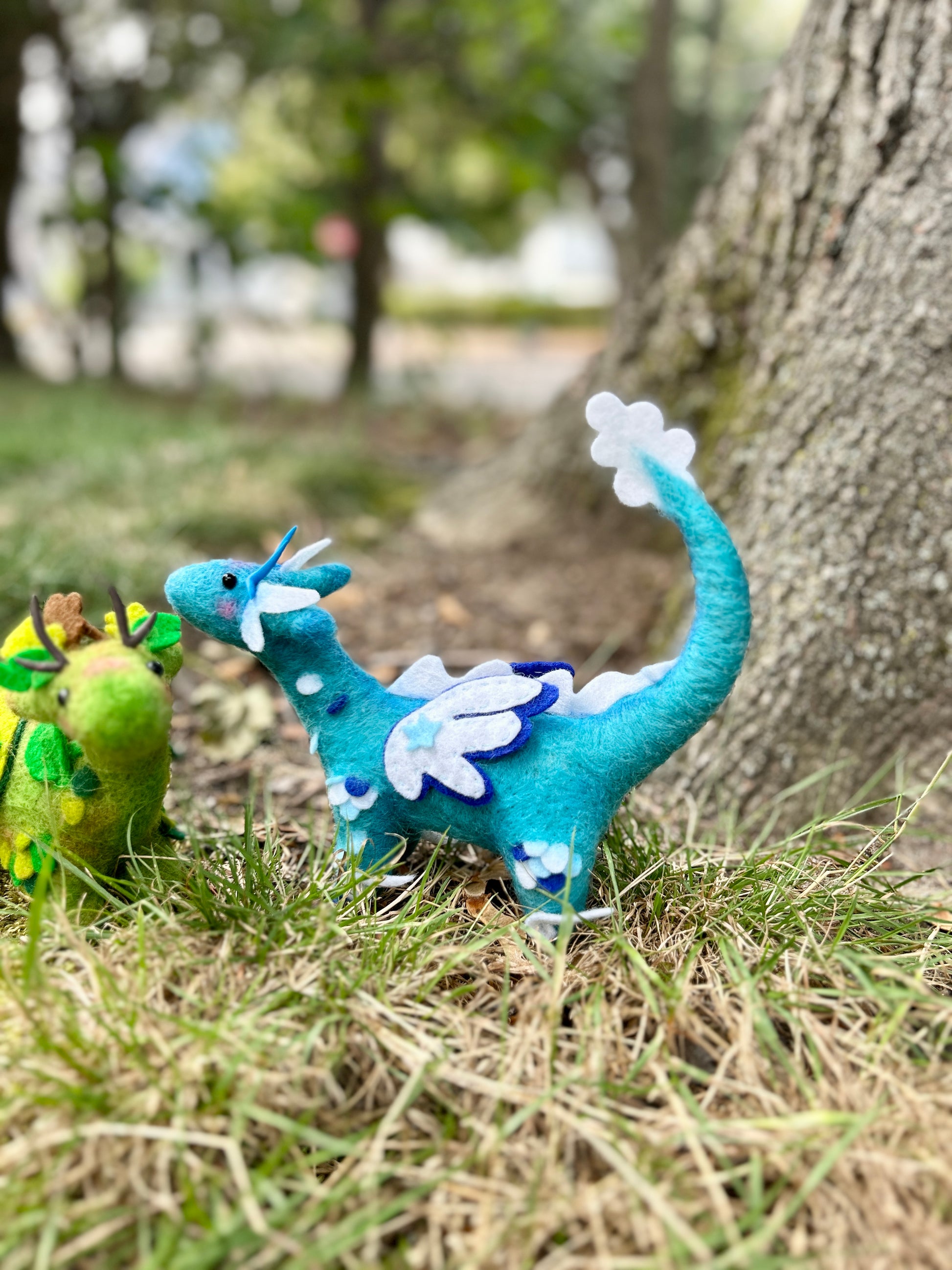 Luft the baby dragon is made from locally sourced corriedale wool fiber, needle felted over an aluminum wire armature. Her head and neck are poseable. Wings, scales and tail are made from hand-sewn wool felt. Luft is one of a kind and ready to ship!