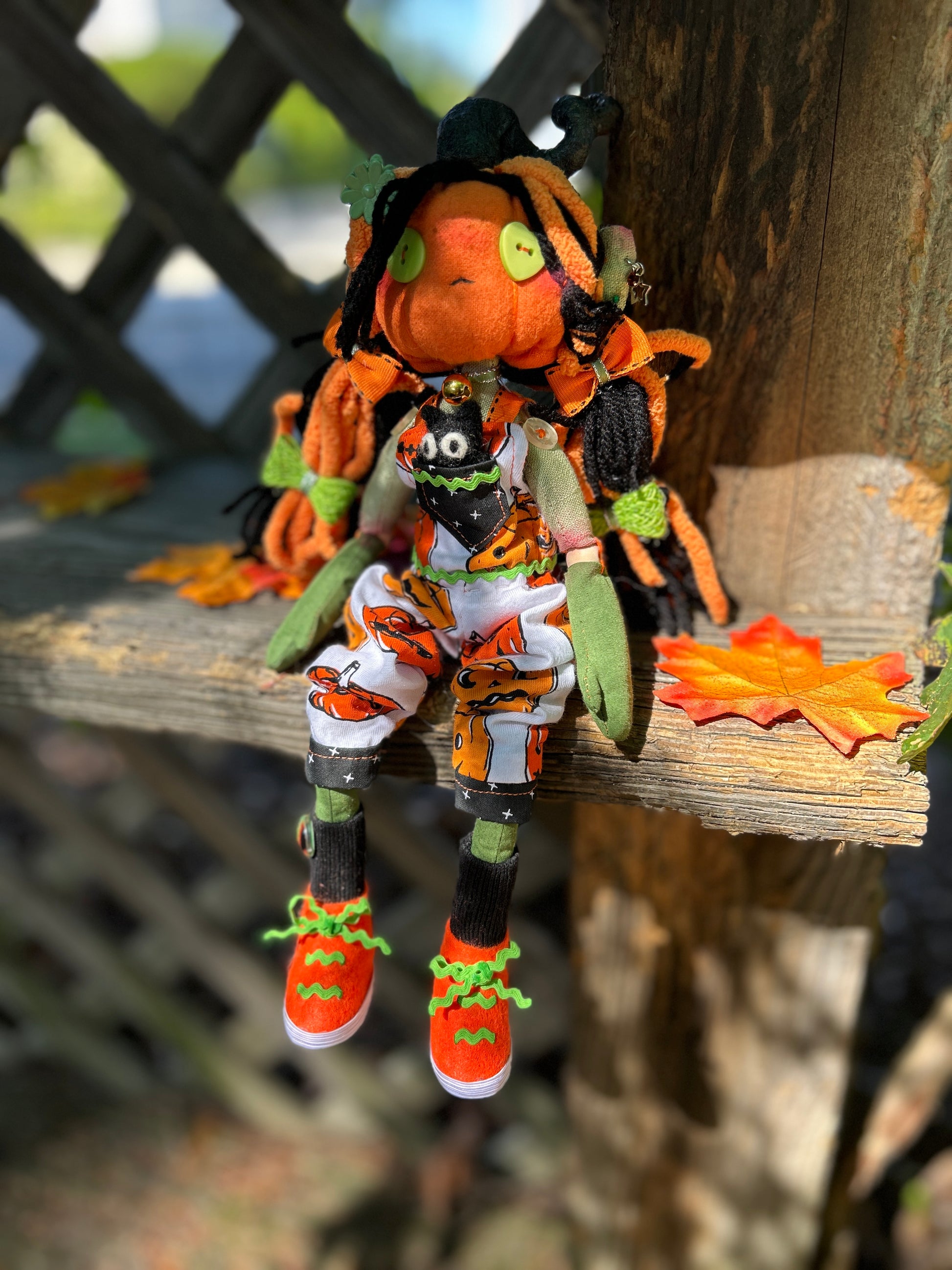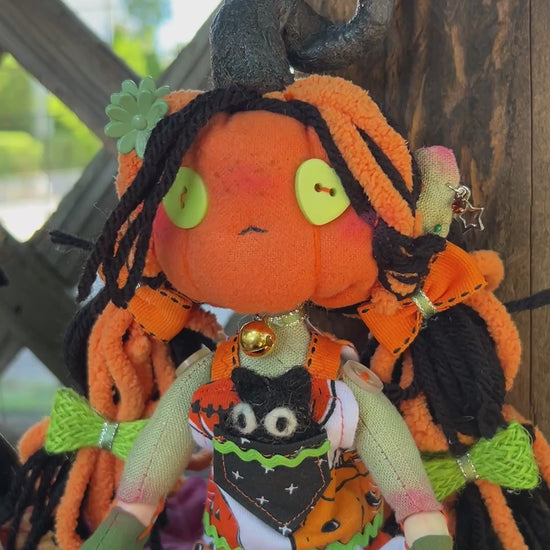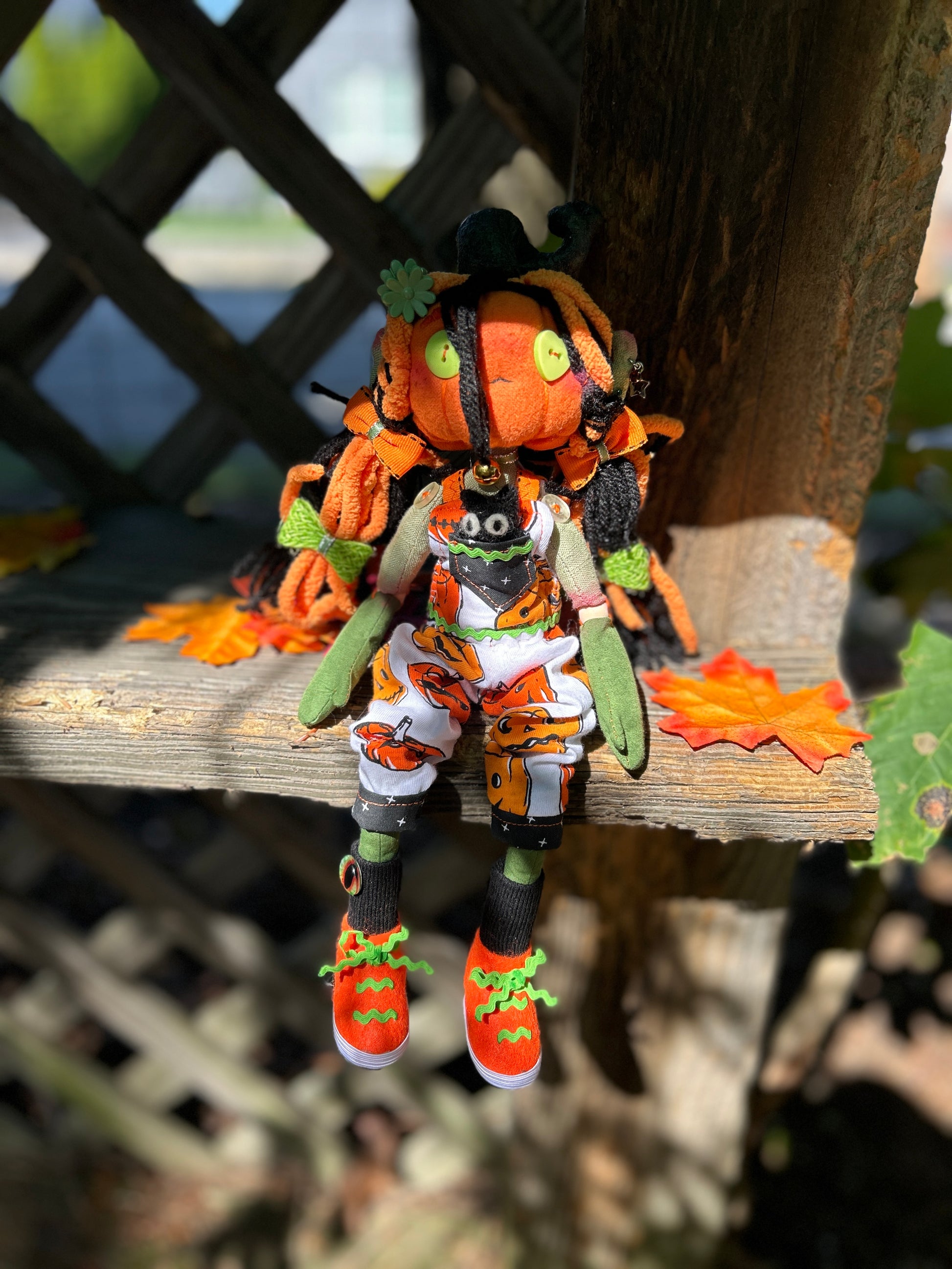 Tobey - short for October - is a one of a kind rag doll with wooden ball joints. Her body was completely handmade by me from start to finish. Her pumpkin head is flannel and her body cotton. Her outfit was also patterned, cut and sewn by me from a pumpkin-print four way stretch jersey. I even cobbled her little sneakers out of craft felt, elastic and rick rack.