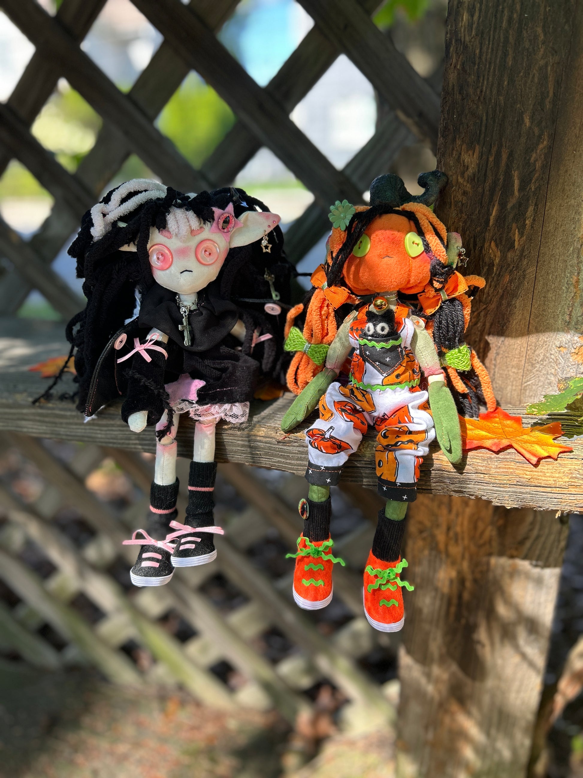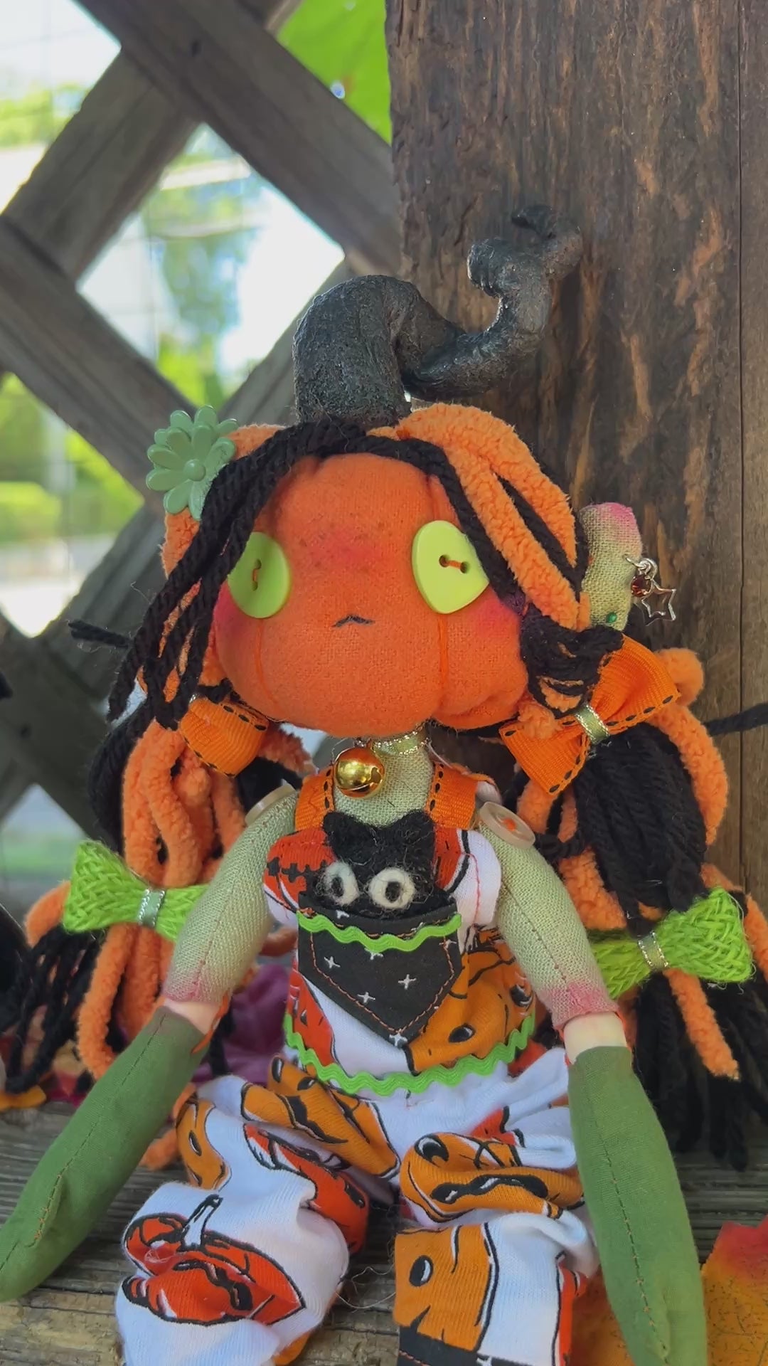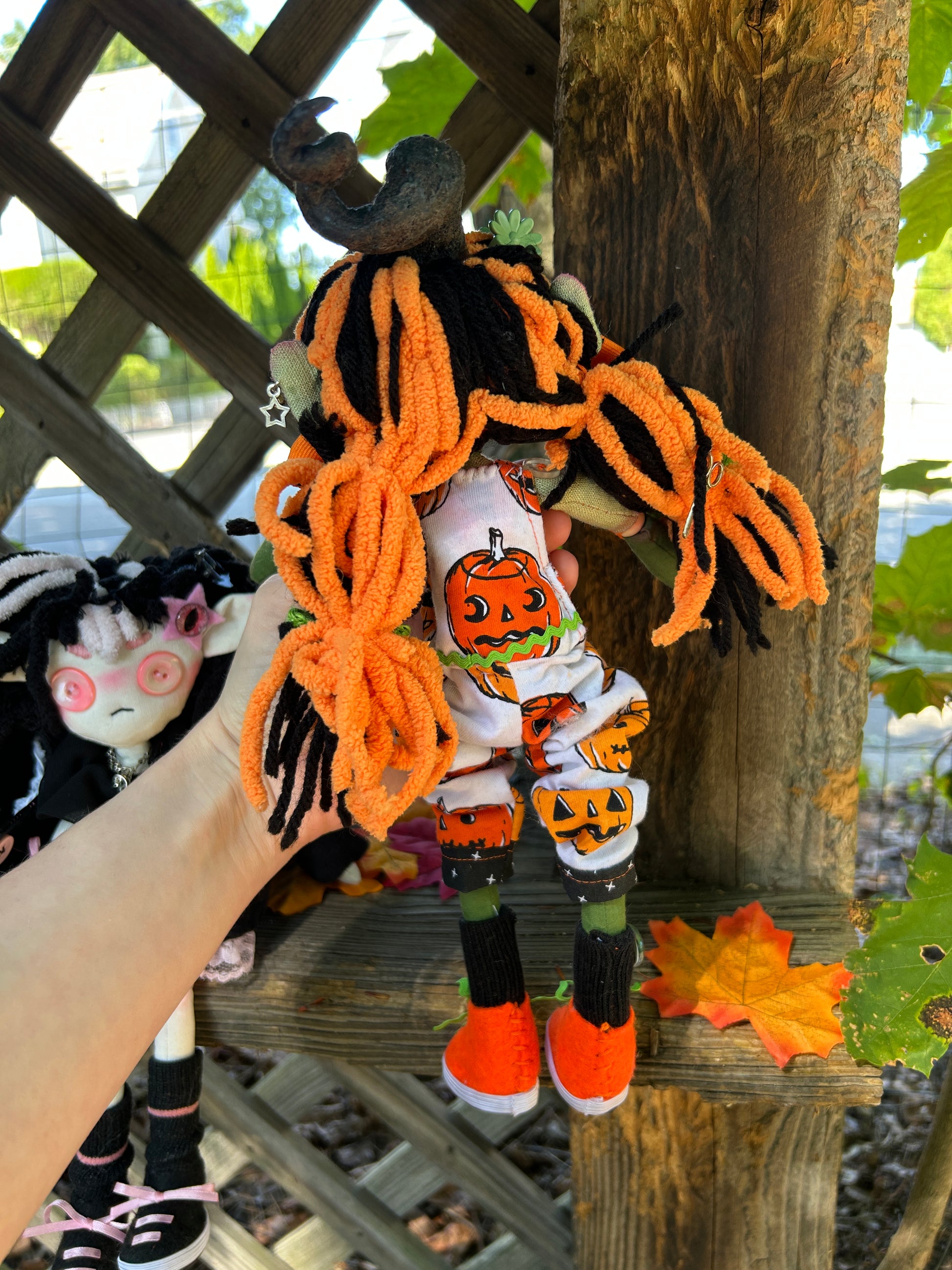 Tobey - short for October - is a one of a kind rag doll with wooden ball joints. Her body was completely handmade by me from start to finish. Her pumpkin head is flannel and her body cotton. Her outfit was also patterned, cut and sewn by me from a pumpkin-print four way stretch jersey. I even cobbled her little sneakers out of craft felt, elastic and rick rack.