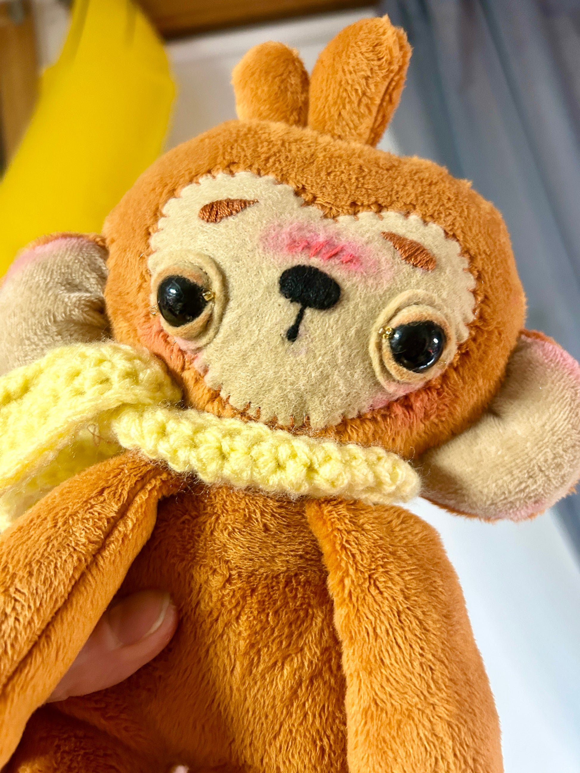 Boba the Monkey is 100 % handmade, and around 8" tall when seated. He is made with super soft minky fabric and faux fur. Boba is weighted with poly pellets in his feet, buns and arms. His face details are handsewn with craft felt and embroidered with cotton floss. His scarf is crocheted with acrylic yarn.